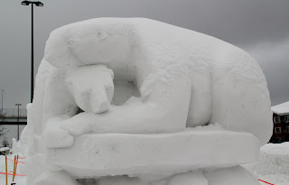 We wondered over to the snow sculptures after the carnival. These large chunks of snow were delivered on Feb 25 and the teams had 24 hours to finish the sculpture. You can see the walrus on the bottom and there are several levels of the different sea animals on a piece of ice.